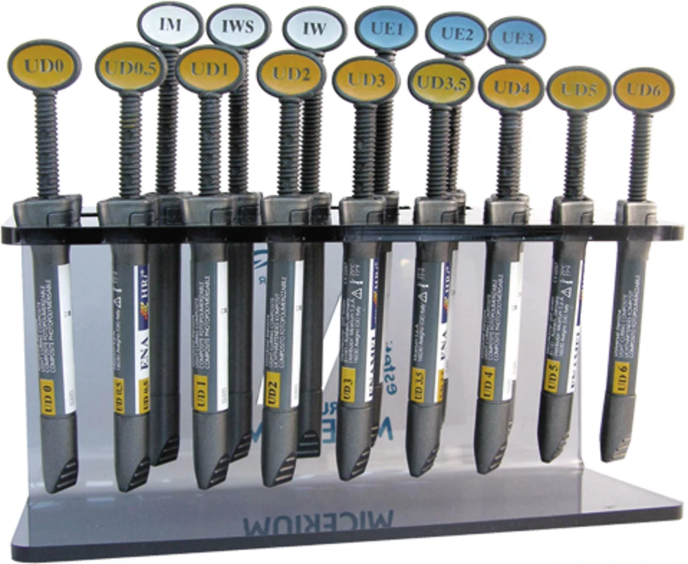 Diese Farben dienen zur weiteren Charakterisierung des Schmelzes (Grate und Höcker) und werden innerhalb der Oberfläche eines Universalschmelzes verwendet, um eine Hypokalzifizierung oder andere extrem weiße Bereiche zu imitieren. Die intensiven weißen Farbtöne stellen demineralisierte Schmelzbereiche dar und können in allen Bereichen des Zahns (zervikales, mittleres und inzisales Drittel) erscheinen.