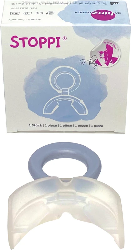 Der STOPPi® ist eine Mundvorhofplatte aus Silikon mit seitlichen Aufbissen, um das Gerät besser im Mund zu halten. Er ist dadurch gekennzeichnet, dass sich kein frontaler Aufbiss zwischen den Zähnen befindet, so dass kein offener Biss begünstigt wird und bei geringfügiger Bissöffnung eine unbehinderte Selbstregulierung möglich ist. Frühzeitiges Abgewöhnen des Lutschens mit dem Stoppi® – spätestens mit Abschluss des 2. Lebensjahres – verhindert Zahnfehlstellungen und Kieferanomalien. Wird das Nuckeln zur dauerhaften Lutschgewohnheit, stören Beruhigungssauger, Daumen, Finger und Dauernuckelflasche die normale Entwicklung der Kiefer.