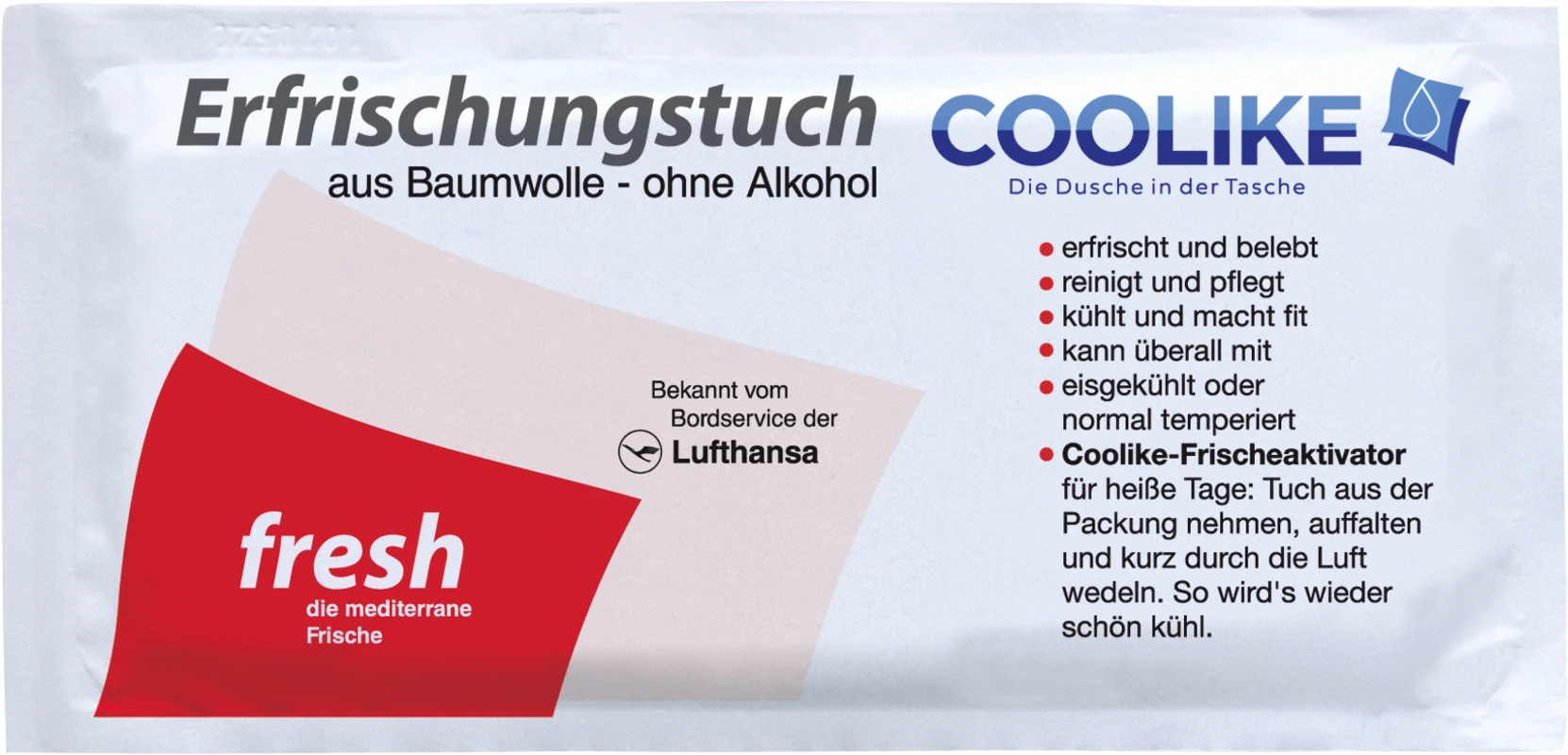 Coolike-Frischeaktivator für heiße Tage. Tuch aus der Packung nehmen, auffalten und kurz durch die Luft wedeln. So wird´s wieder schön kühl. Original Erfrischungstücher aus weicher Baumwolle, ohne Alkohol.