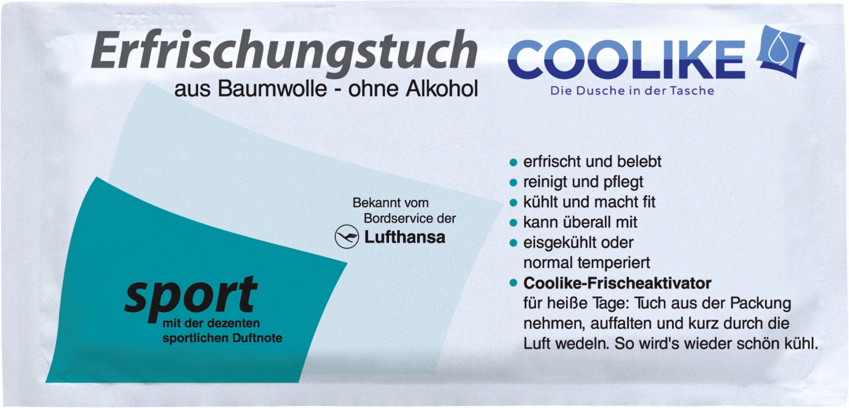 Coolike-Frischeaktivator für heiße Tage. Tuch aus der Packung nehmen, auffalten und kurz durch die Luft wedeln. So wird´s wieder schön kühl. Original Erfrischungstücher aus weicher Baumwolle, ohne Alkohol.