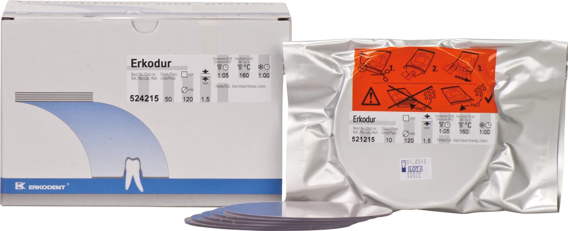 Erkodur ist eine zähharte, glasklare Folie. Äußerst schlagzäh. Sehr gut tiefziehbar. Verbindet sich mit Autopolymerisat. Kein Vortrocknen nötig. Mit Unterziehfolie als Schrumpfausgleichs- und Isolierfolie für Aufbiss-, Knirscher-, Stabilisierungs-, Drum- und Miniplastschienen, Verbandplatten, Gussformteilen.