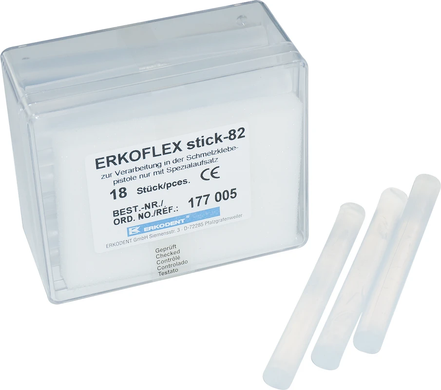 Bei der Positionerherstellung für das Zusammenfügen der OK- und UK-Schiene und zur Fixierung der Modelle bei der Einartikulierung. Zur Verarbeitung von ERKOFLEXsticks muss eine Spezialdüse (größerer Auslaß) verwendet werden. Shore A Härte 82.