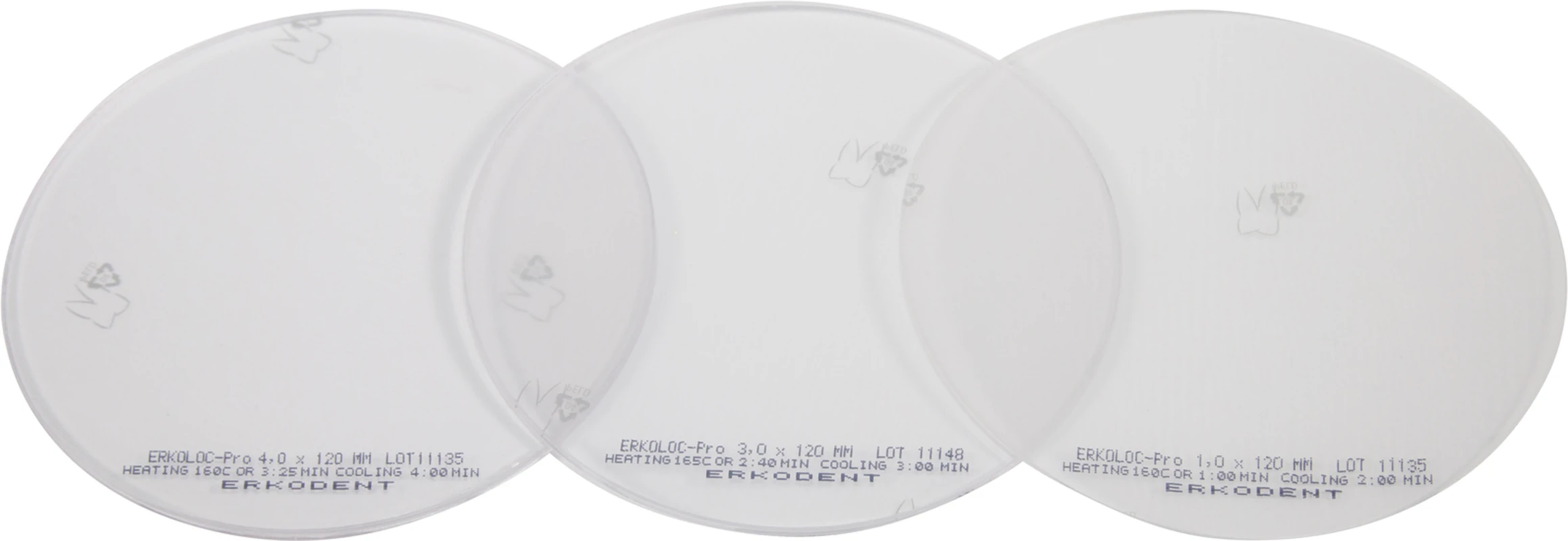 Komfortable Miniplast- und Aufbissschienen 1-5 mm, weiche Seite immer 1 mm stark bei 2-5 mm Gesamtstärke, weiche Seite 0,4 mm stark bei 1+1,3 mm Gesamtstärke. Harte Seite verbindet sich mit Resilit-S (Autopolimerisat, Flüssigkeit/Pulver). Silensor-sl Schnarchschutz 3 mm, komfortable Retentionsschienen mit korrektiver Wirkung 1-2 mm. Bleachingschienen 1 mm.