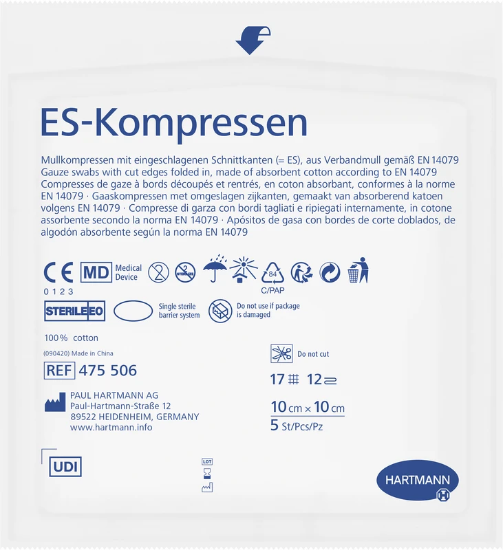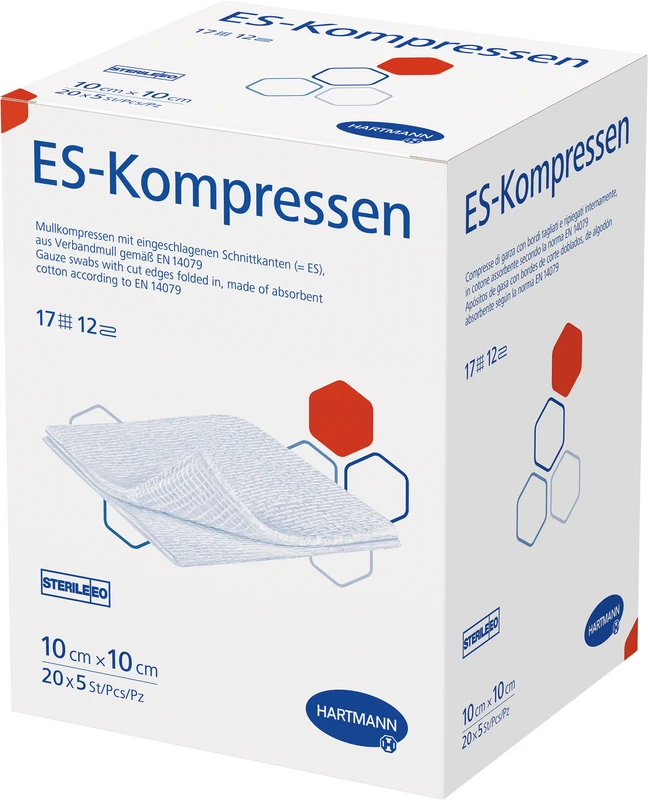 Die klassischen Mullkompressen mit den eingeschlagenen Schnittkanten.Aus Verbandmull EN 14079, 17-fädig, mit eingeschlagenen Schnittkanten (= ES); auch mehrfach aufgeklappt in größeren Formaten verwendbar, ohne dass störende Randfäden auftreten; gute Saugfähigkeit, luftdurchlässig, weich und geschmeidig.