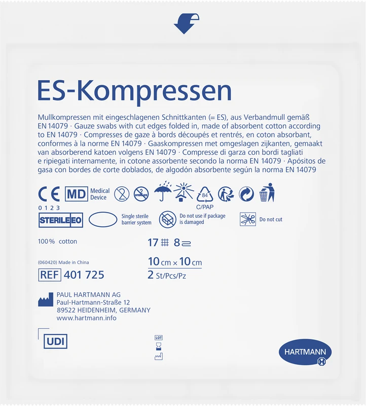 Die klassischen Mullkompressen mit den eingeschlagenen Schnittkanten.Aus Verbandmull EN 14079, 17-fädig, mit eingeschlagenen Schnittkanten (= ES); auch mehrfach aufgeklappt in größeren Formaten verwendbar, ohne dass störende Randfäden auftreten; gute Saugfähigkeit, luftdurchlässig, weich und geschmeidig.