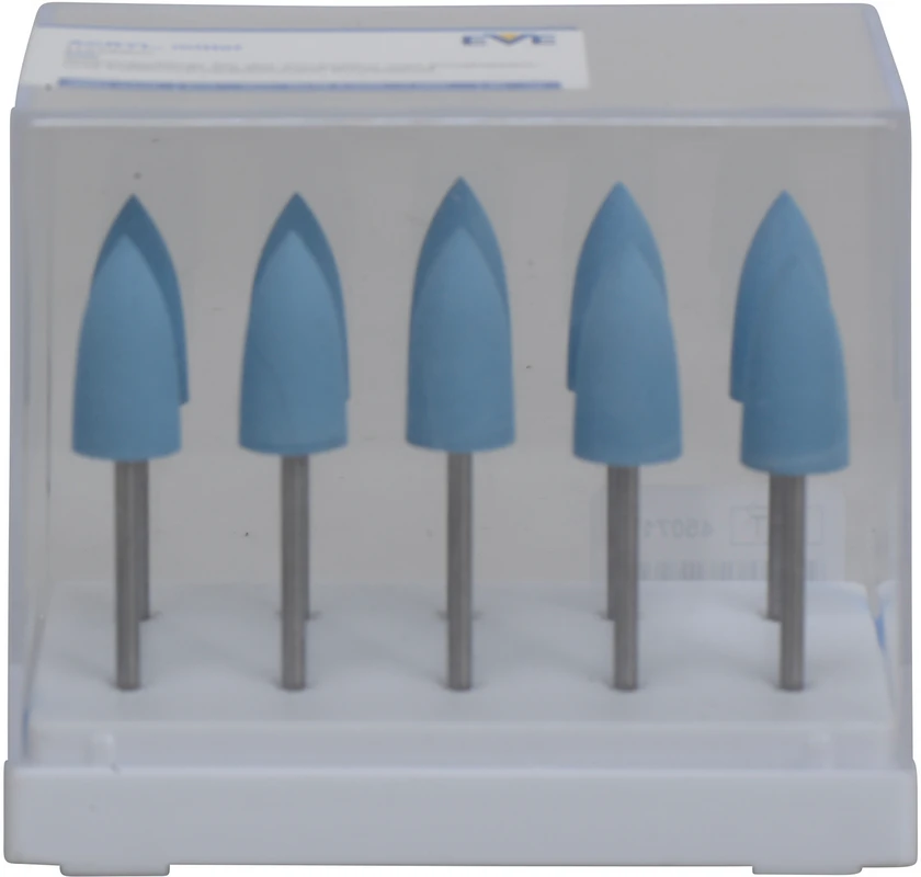 Poliersystem für die Bearbeitung von Acryl, Prothesen- und kieferorthopädischen Kunststoffen. Schleifkorn: Aluminiumoxid.