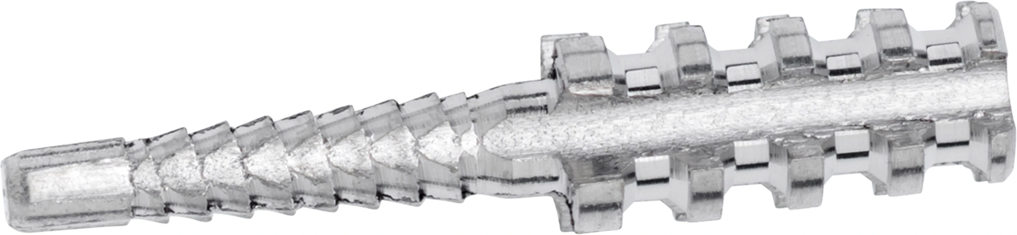 Exatec–S Wurzelstift mit selbstschneidenden Sägezähnen für Zähne mit starker Wurzel. 4 Abflußrillen Großer Stiftquerschnitt (> 3 mm²) und gerundeter Übergang für hohe Festigkeit Selbstschneidende Sägezähne Abgerundetes Stiftende Das Exatec-S Einsetz-Tool (29581) wird dazu verwendet, den Exatec-S Wurzelstift im Stiftkopf-Bereich zu halten und den Wurzelstift mit der Hand einschrauben zu können Inhalt: Wurzelstifte