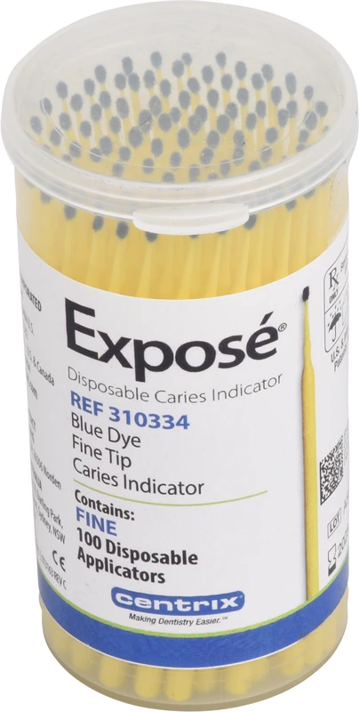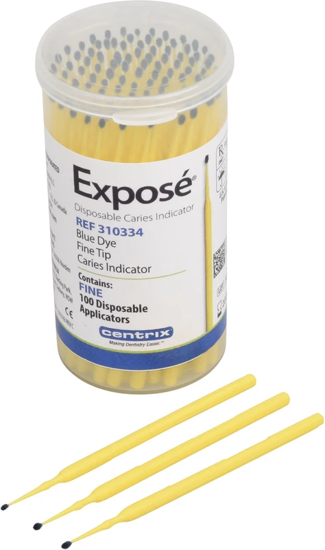 Exposé ist ein Kariesindikator, der in ein Applikator- und Abgabesystem eingebaut ist! Die Detektorlösung ist bereits auf unsere Benda Mikroapplikatoren aufgebracht. Exposé einfach durch Berühren einer feuchten Zahnoberfläche aufbringen, und Exposé färbt infiziertes Dentin an. Kein Entnehmen, kein Tropfen, kein Verschmutzen! Exposé beseitigt das gefürchtete Verschmutzen durch Großbehälter oder Spritzen mit Pinselspitze. Wir bei Centrix machen Zahnheilkunde einfacher.