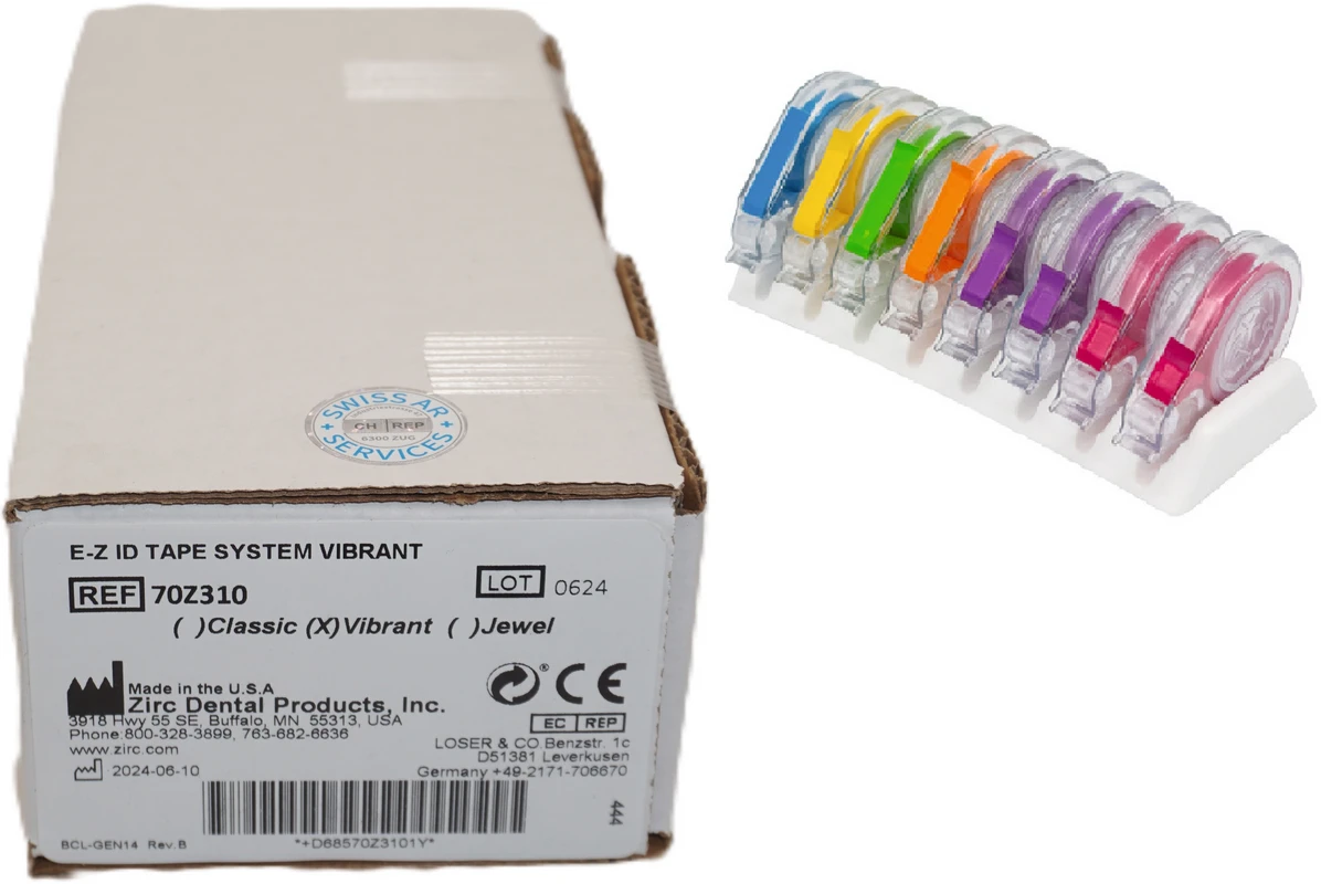Mit den E-Z ID Bändern wird ein farbliches Markieren unterschiedlichster Praxisuntensilien, speziell größerer Instrumente, Aufbewahrungsmöglichkeiten etc., ermöglicht. So können viele Abläufe in der Praxis schnell und einfach organisiert werden. Das Abrollen und Aufbringen des Bandes ist durch den Spender mit seiner praktischen Abtrennhilfe denkbar einfach. E-Z ID Markierungsbänder sind desinfizier- und autoklavierbar. Ein Gutachten zur validierten Aufbereitung ist verfügbar. In 16 Farben (A–S) erhältlich. Im Sortiment und einzeln lieferbar.