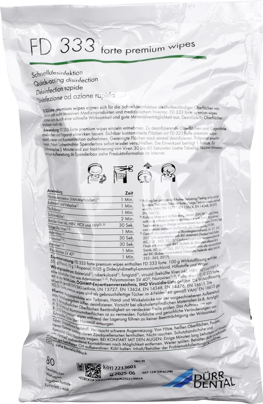 - Wirkungsspektrum: Bakterizid, mykobakterizid, tuberkulozid, levurozid, fungizid, viruzid (behüllte Viren inkl. HBV, HCV, HIV und Coronaviren sowie unbehüllte Viren wie Adenoviren, Polyomaviren SV 40, Noroviren und Polioviren). VAH-Liste, IHO-Desinfektionsmittelliste. Die Wirkstofflösung ist geprüft gemäß DVV/RKI-Leitlinie, EN 13727, EN 13624, EN 14348, EN 14476, EN 16615. Die FD 333 forte premium wipes sind als gebrauchsfertige Tücher im 4-Felder-Test gemäß VAH/EN 16615 geprüft