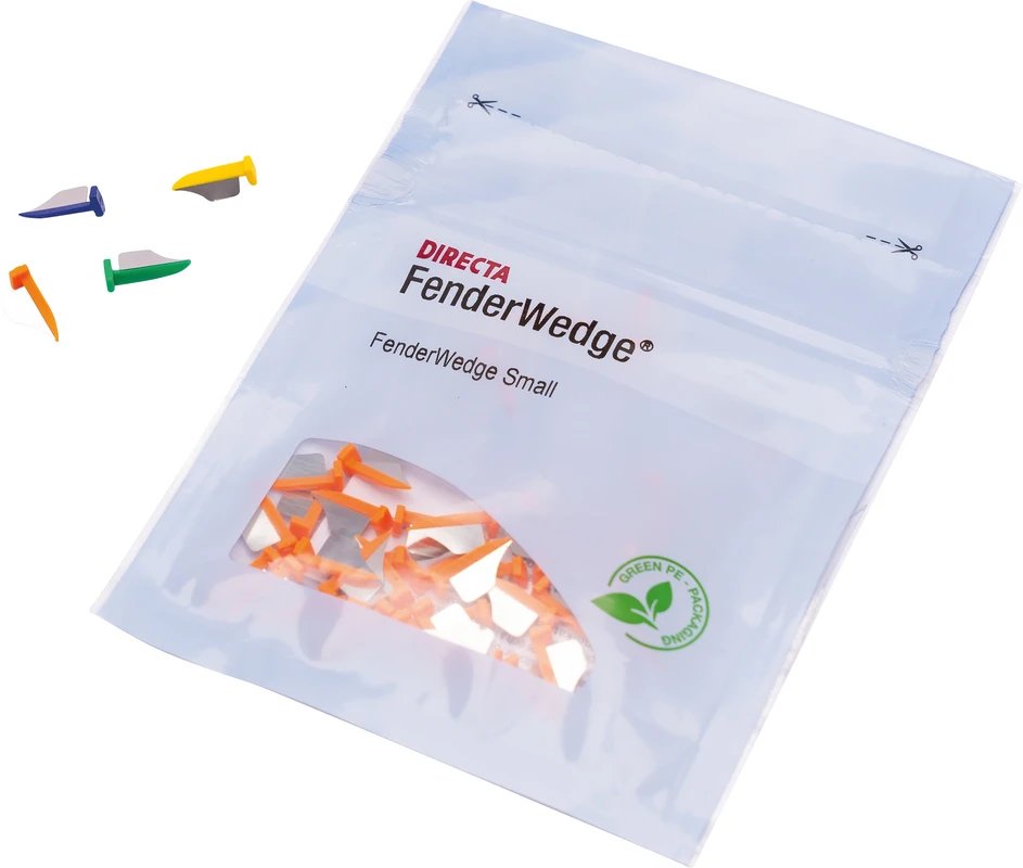 Bei ca. 70 % der Klasse II Präparationen werden Nachbarzähne geschädigt. FenderWedge® schützt die Nachbarzähne während der Präparation. FenderWedge® ist einfach zu platzieren, positionsbeständig während der Präparation und stört nicht im Arbeitsbereich. Die auf den Kunststoffkeilen befestigten Edelstahlplättchen sind bei allen Größen 0,08 mm dünn.