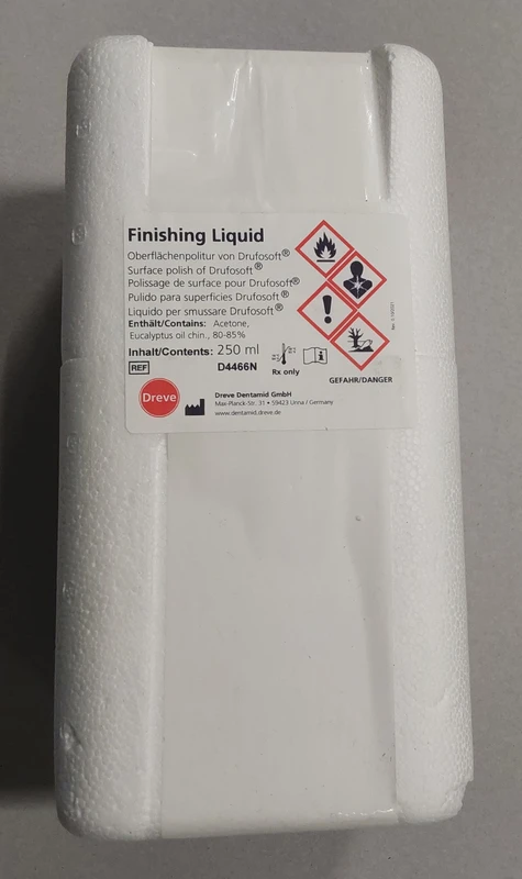 Finishing-Liquid erzeugt eine glatte und glänzende Oberfläche auf bearbeitetem Drufosoft® und Drufosoft®-shells.