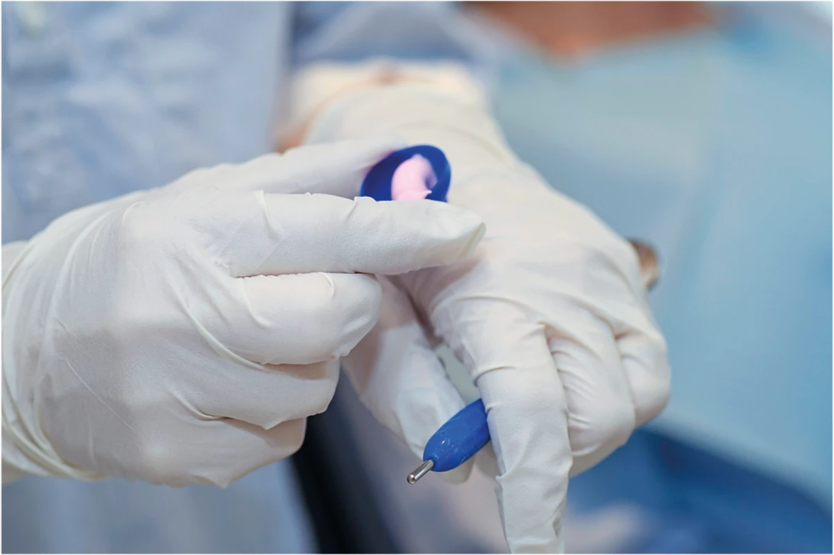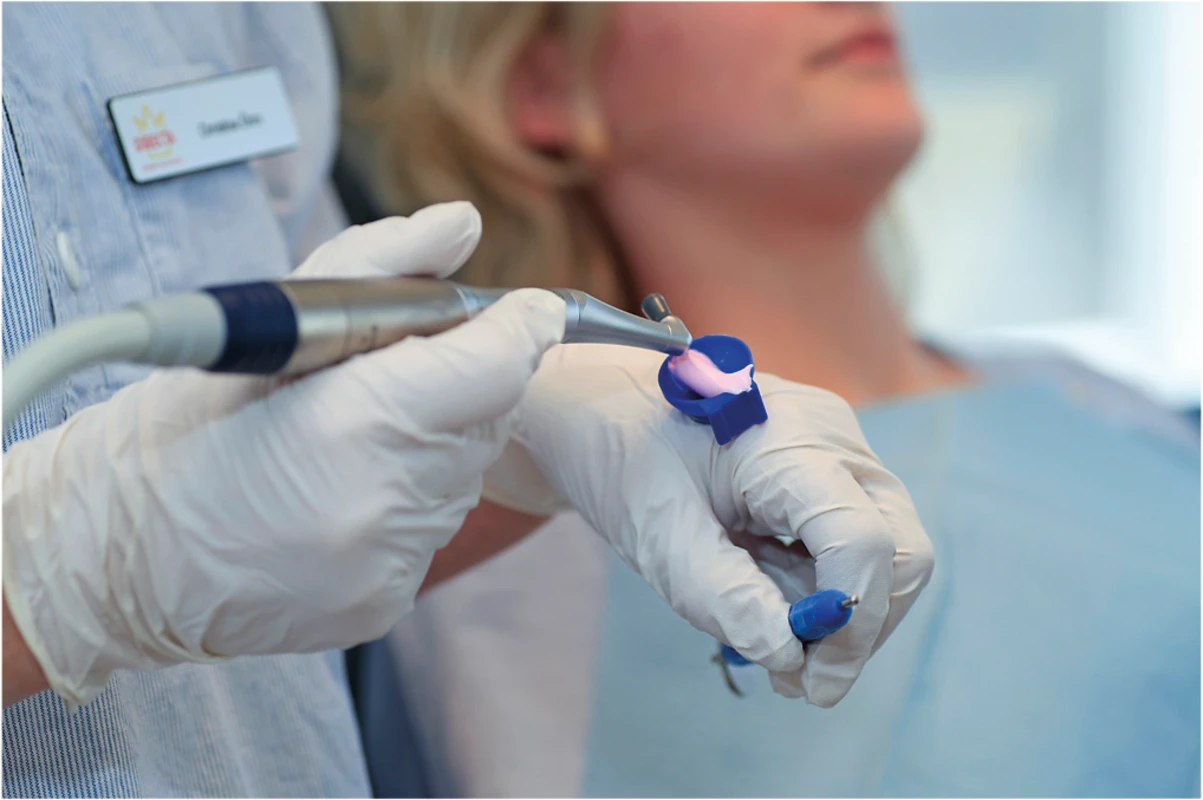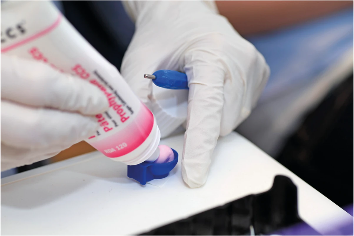 Eine praktische und hygienische Alternative zur Verwendung von ProphyCare- Prophy-Pasten. Geben Sie die benötigte Menge an Prophylaxepaste in den Einwegbecher FixyDap. Befestigen Sie diesen an der Seite eines Tabletts oder nutzen Sie die Klebefläche, um es auf eine beliebige Oberfläche, z. B. einen Handschuh, zu kleben.
