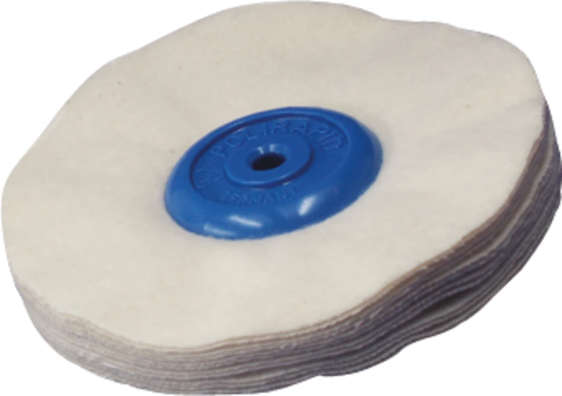 Flanellschwabbel mit konischem Kunststoff (KK)- oder Lederkern (LK) in verschiedenen Durchmessern und Stärken. Polierscheiben aus weichem Flanellstoff.