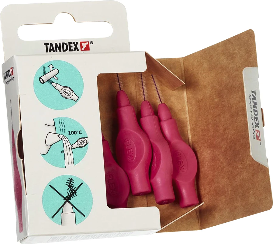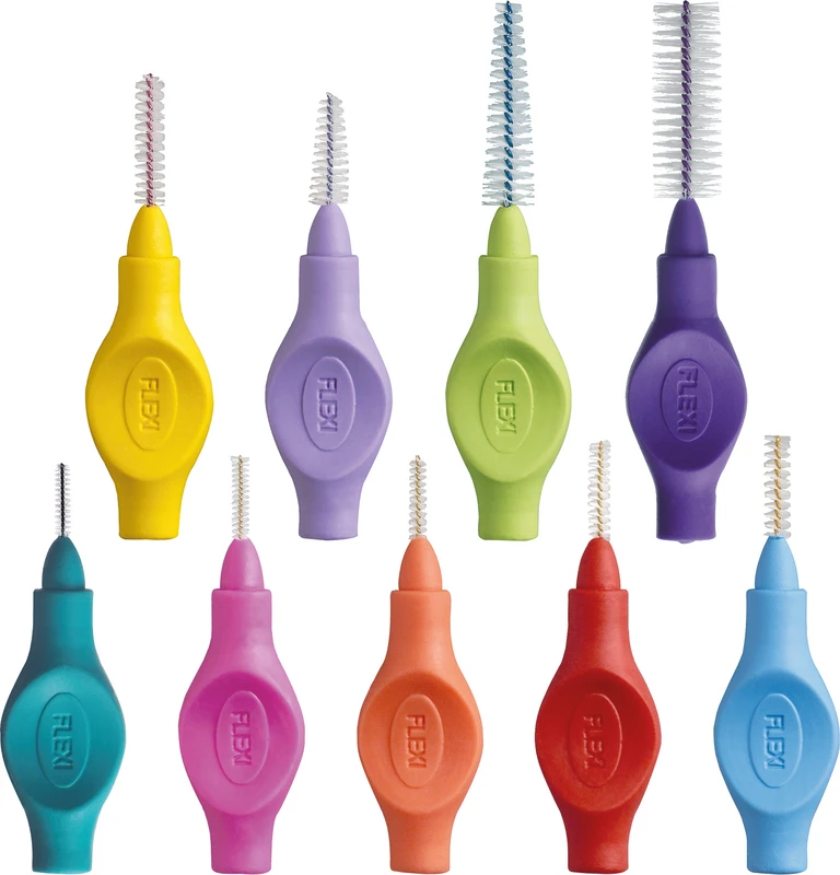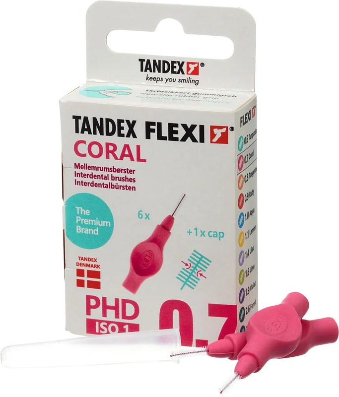 Der ergonomische Gummigriff und die weiche Soft-Griffschicht, ermöglicht einen sicheren Halt – sogar wenn die Finger feucht sind. Der flexible Griff ist frei von Phtalate und trägt zu einer bequemen Reinigung in allen Interdentalräumen bei. Der kunststoffbeschichtete Draht ist ausdauernd und schützt Zahnfleisch und Zahnschmelz. 11 farbkodierte Gröβen - Besonders für die tägliche Reinigung von Interdentalräumen, festen Zahnspangen und Zähnen mit Furkationsbefall. Zwei Packungsgröβen aus recyclebarer FSC-zertifizierter Pappe: 6 Stück einschl. Schutzhaube. 25 Stück Value Pack einschl. Schutzhauben. FLEXI® Interdentalbürsten PHD sind in Zusammenarbeit mit dänischen Zahnärzten und Prophylaxe Assistenten entwickelt worden, um den Patienten das optimale Hilfsmittel für die Zahnzwischenraumpflege empfehlen zu können.