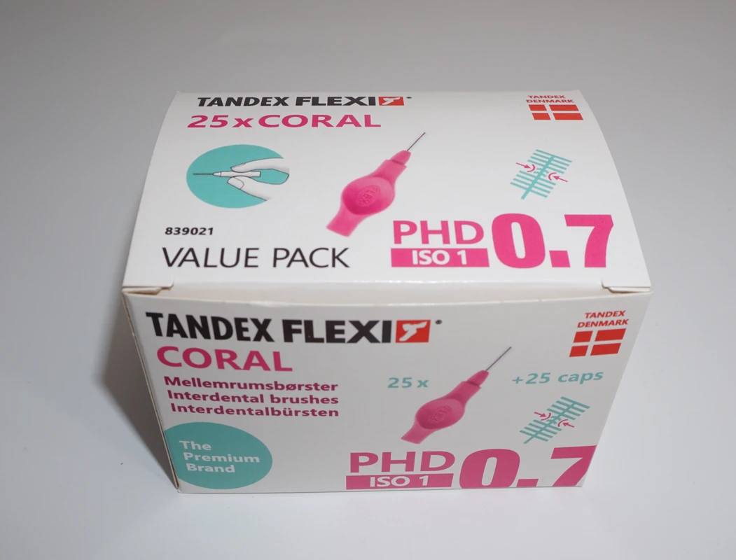 Der ergonomische Gummigriff und die weiche Soft-Griffschicht, ermöglicht einen sicheren Halt – sogar wenn die Finger feucht sind. Der flexible Griff ist frei von Phtalate und trägt zu einer bequemen Reinigung in allen Interdentalräumen bei. Der kunststoffbeschichtete Draht ist ausdauernd und schützt Zahnfleisch und Zahnschmelz. 11 farbkodierte Gröβen - Besonders für die tägliche Reinigung von Interdentalräumen, festen Zahnspangen und Zähnen mit Furkationsbefall. Zwei Packungsgröβen aus recyclebarer FSC-zertifizierter Pappe: 6 Stück einschl. Schutzhaube. 25 Stück Value Pack einschl. Schutzhauben. FLEXI® Interdentalbürsten PHD sind in Zusammenarbeit mit dänischen Zahnärzten und Prophylaxe Assistenten entwickelt worden, um den Patienten das optimale Hilfsmittel für die Zahnzwischenraumpflege empfehlen zu können.