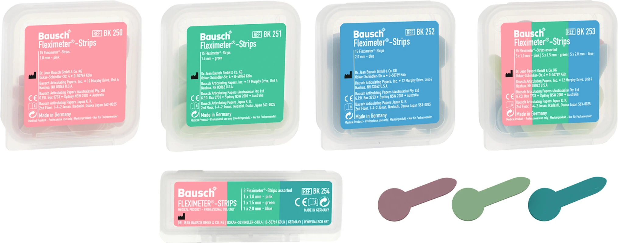 Fleximeter-Strips sind flexible Messlehren, bis 200°C sterilisierbar, in drei verschiedenen Stärken zur Messung der Präparationshöhe von Zähnen für Restaurationen. Die Stärken der Fleximeter-Strips von 1,0 mm, 1,5 mm und 2,0 mm können auch genutzt werden, um die Vertikaldimension (Bisshöhe) definiert zu vergrößern.