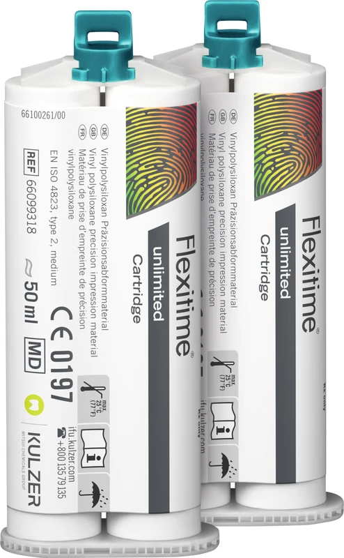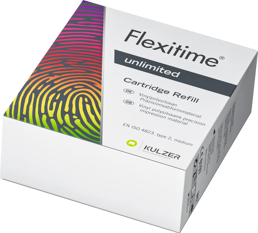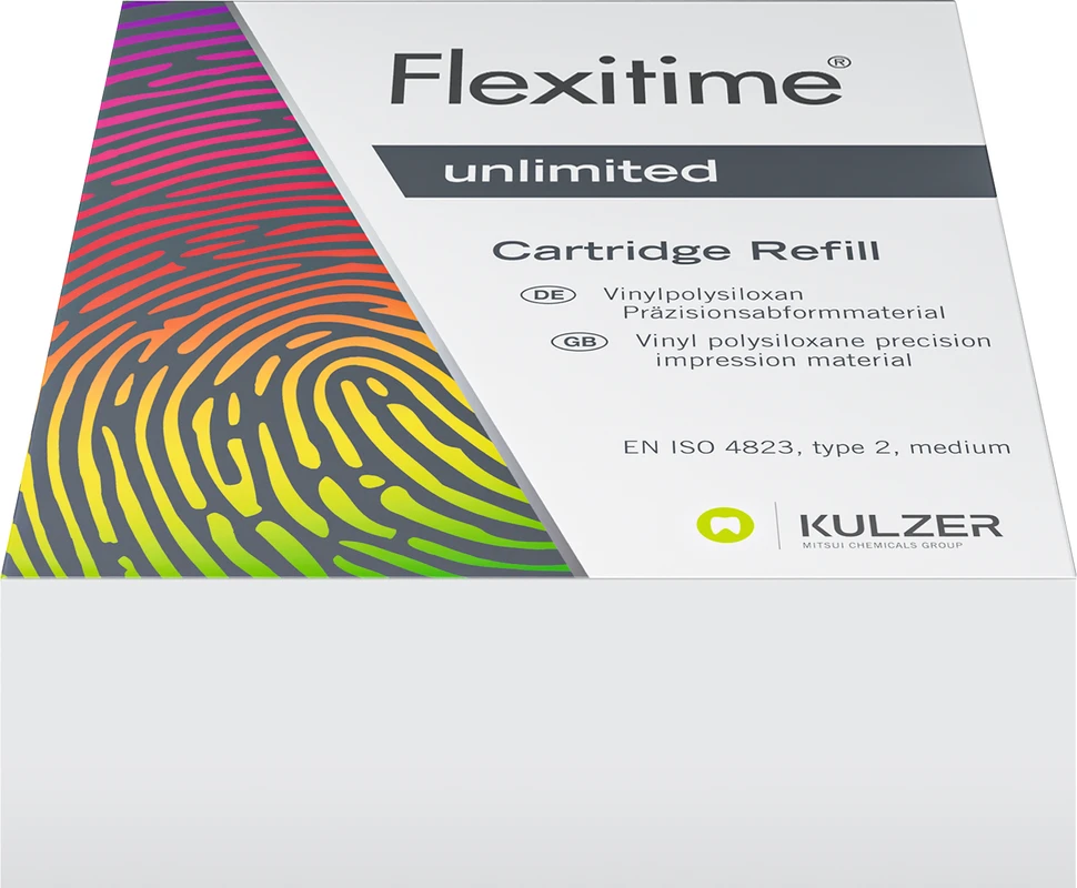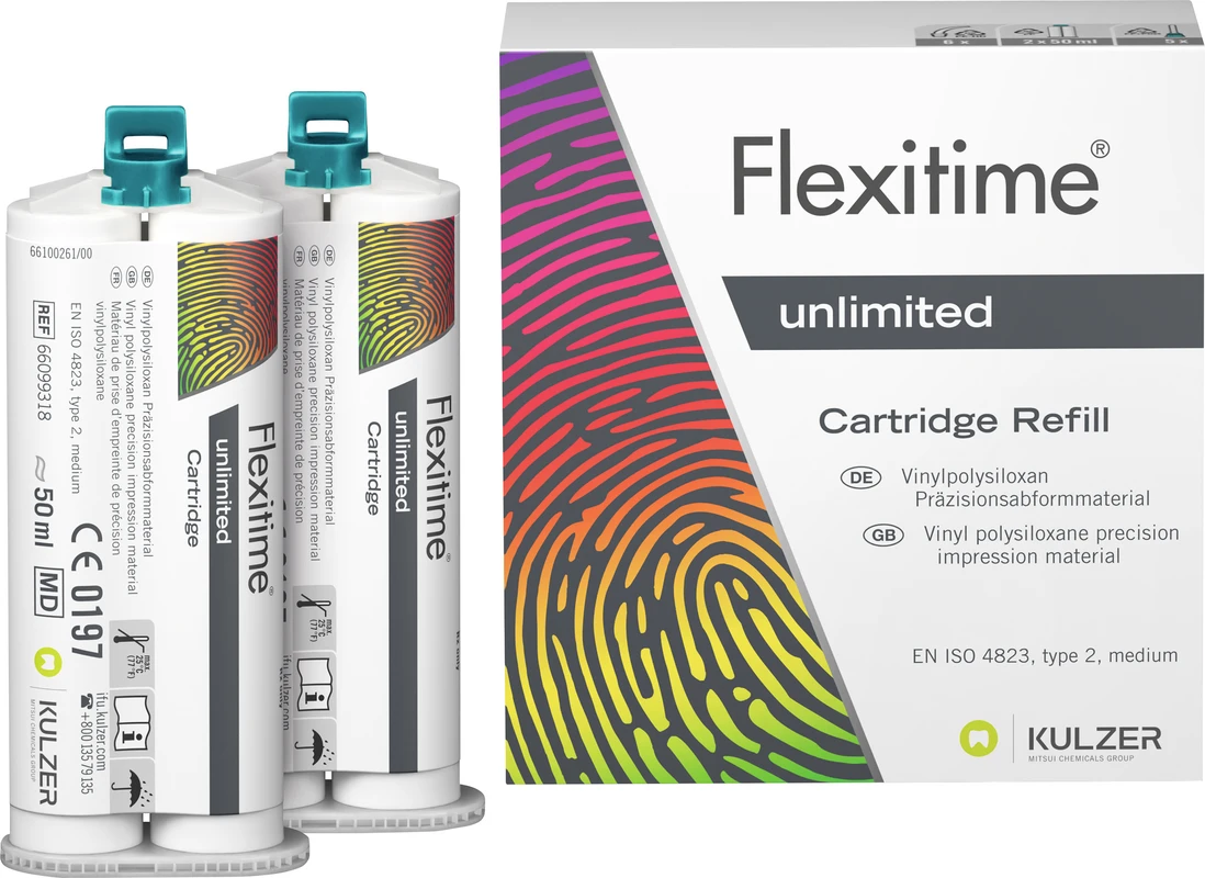 Mit Flexitime® unlimited setzen Sie auf ein innovatives Abformmaterial, das alle Indikationen abdeckt. Es wurde entwickelt, um den gesamten Abformprozess zu vereinfachen und zu standardisieren – speziell für die Implantat- und Teleskop-Abformtechnik in der Monophasentechnik. Darüber hinaus kann es sowohl in Kombination mit Flow-Materialien als auch für alle weiteren Abformverfahren eingesetzt werden. Flexitime® unlimited basiert auf den bewährten Flexitime® Präzisionsabformmaterialien mit ihrer flexiblen Verarbeitungszeit (Zeitfenster zwischen 1:00 min. und 2:30 min.) und zeichnet sich weiter durch hervorragende physikalische Eigenschaften aus.