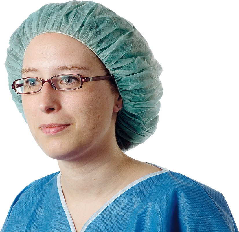 Universelle Baretthaube mit umlaufendem Gummizug; besonders leicht, auch als Kopfbedeckung für Patienten geeignet.
