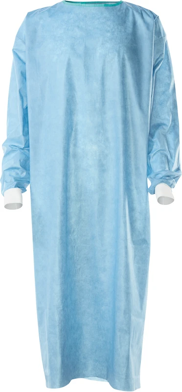 Einmal-OP-Mäntel aus mehrschichtigem flüssigkeitsabweisendem Vliesstoff; mit hohem Widerstand gegen Durchfeuchtung und Keimdurchwanderung; abriebfest und fusselarm; mit ultraschall verschweißten Nähten, stabilen Bändern und elastischen, langen Strickbündchen; mit Einschlag & Papierhandtüchern.