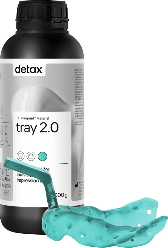 FREEPRINT® TRAY 2.0 Lichthärtende Formulierung zum 3D Druck von individuellen Abdruck-, funktionellen Abformlöffeln und Basiskunststoffplatten. Niedrigviskos für geringen Materialverbrauch und schnellere Reinigung. Maximale Baugeschwindigkeit, höchste Formstabilität und Verwindungsfestigkeit für eine exakte und verzugsfreie Abdrucknahme. Perfekt für die Implantatabformung innerhalb des digitalen Workflows. Druckbar mit 200 μm Schichtstarke. Keine mechanische Nachbearbeitung der Oberflache notwendig. Für alle Löffeladhäsive und Abformmaterialien geeignet, MMA & THF-MA frei. Geruchs- und geschmacksneutral. Medizinprodukt der Kl. I, Farbe: grün