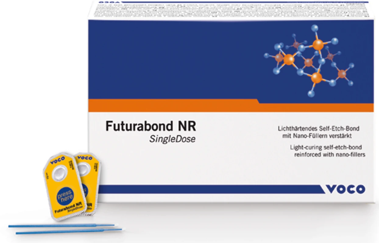 Lichthärtendes, selbstätzendes Dentin-Schmelzbond. Als Non-Etch-Bond spart Futurabond NR Zeit und ist patientenfreundlich, denn das separate, aufwendige Ätzen von Schmelz und Dentin entfällt. Futurabond NR ermöglicht vergleichbar exzellente Haftwerte auf Schmelz und Dentin wie bei der aufwendigen Total-Etch Technik. Das Bond ist entsprechend dem Wetbonding-Verfahren anzuwenden. Im Bond enthaltene Co-Polymere verleihen dem Haftungssystem elastische Eigenschaften, die starke Belastungen absorbieren und den dichten Randschluß dauerhaft sichern. Futurabond NR gibt Fluoride ab. Fluoride beugen Sekundärkaries vor. Das Bondmaterial ist universell unter allen Compomeren und Compositen einsetzbar.
