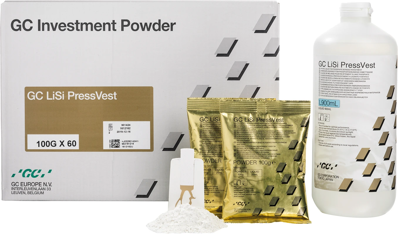 GC LiSi PressVest ist eine kohlenstofffreie, phosphatgebundene Einbettmasse für die Keramik-Presstechnik, die eine einfachere, schnellere und sichere Bearbeitung garantiert. Eine Behandlung mit Flusssäure und das Strahlen mit Aluminiumoxid sind nicht länger notwendig, um die Reaktionsschicht zu entfernen.