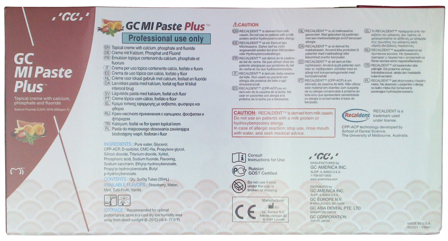 GC MI Paste Plus® enthält darüber hinaus eine einzigartige, patentierte Fluorid-Form. GC MI Paste Plus® setzt alle drei Ionenarten frei, die zur Bildung säureresistenten Fluorapatits benötigt werden, sowohl durch Remineralisierung als auch durch Fluoridierung. CPP-ACP wurde an der School of Dental Science an der Universität von Melbourne Victoria in Australien entwickelt. Recaldent™ ist ein Warenzeichen unter Lizenz. Recaldent™ (CPP-ACP) wird aus Milch-Kasein gewonnen. Nicht anzuwenden bei Patienten mit Allergie gegen Milchprotein- und/oder Hydroxybenzoate.