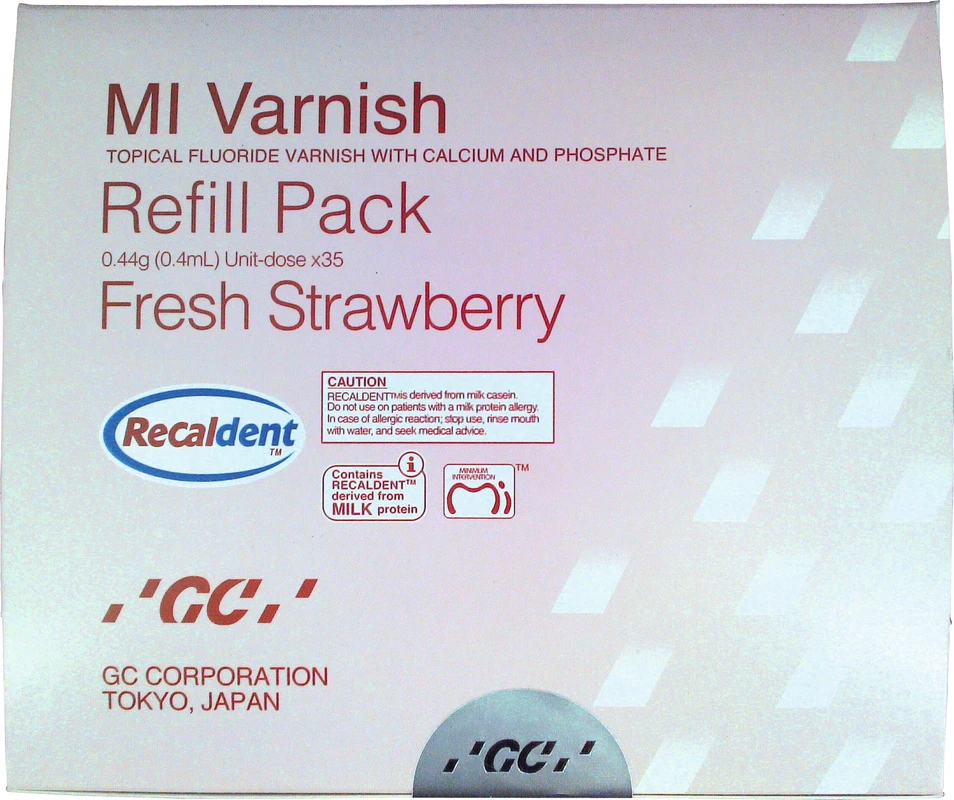 Dank der patentierten Recaldent™-Technologie verschafft MI Varnish Patienten einen Vorsprung beim Kariesschutz, wenn Fluorid, Calcium und Phosphat sich zu einem stabilen Coating verbinden. Der neutrale pH-Wert von 6,6 verbessert die Säureresistenz des Zahnschmelzes und verhindert Mineralverlust. In saurer Umgebung lösen sich Calcium und Fluorid aus der Schutzschicht und die Zähne sind daraufhin den Säuren nicht mehr direkt ausgesetzt.