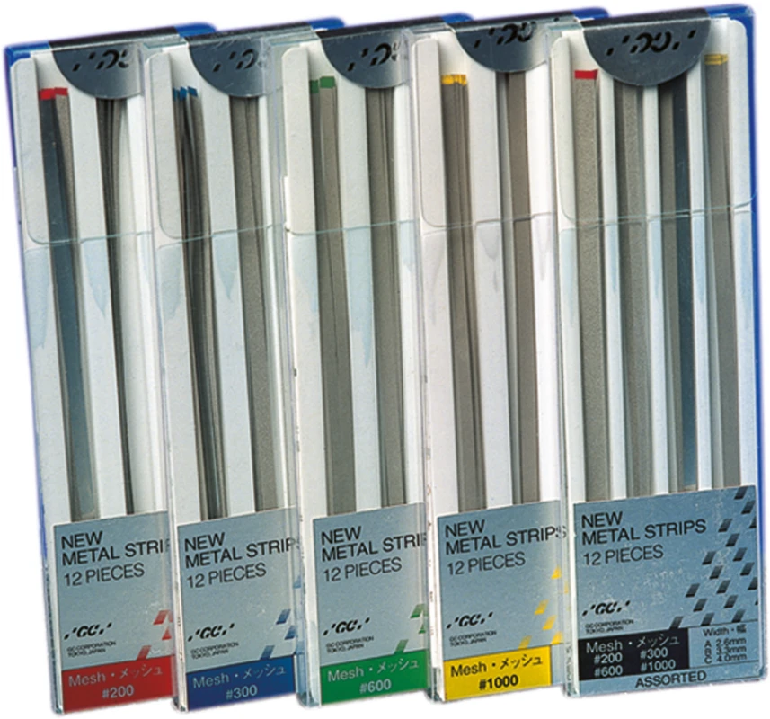 Farbcodierte Metallstreifen mit elektroplatierten Aluminiumoxidpartikeln zum approximalen Konturieren und Finieren sowie Polieren aller Füllungsmaterialien. Handlich, sehr flexibel und langlebig, mehrfach sterilisierbar oder autoklavierbar.