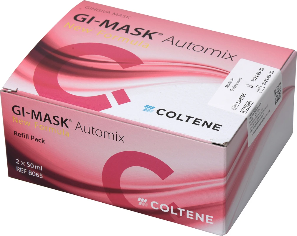GI-MASK® Automix New Formula wird für die präzise Erfassung des Zahnfleischverlaufs verwendet. Diese Zahnfleischmaske aus A-Silikon liefert alle Informationen für die exakte Gestaltung von Implantaten und metallkeramischen Gerüsten.