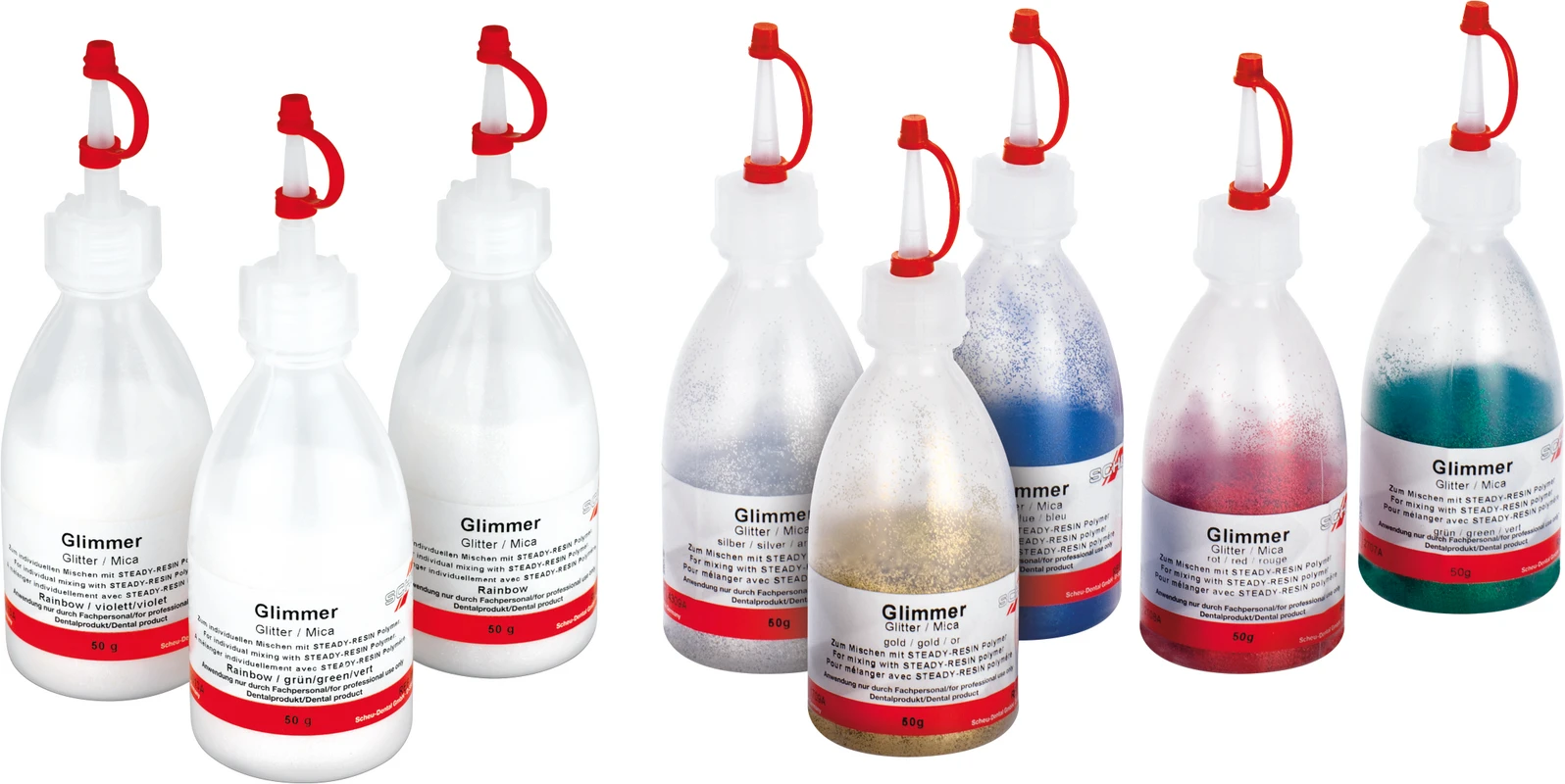 Zum individuellen Mischen mit STEADY-RESIN und DURASPLINT. Die Sorten rainbow, rainbow green und rainbow violet sind komplett metallfrei und sorgen für irisierende Effekte in zarten Pastelltönen.