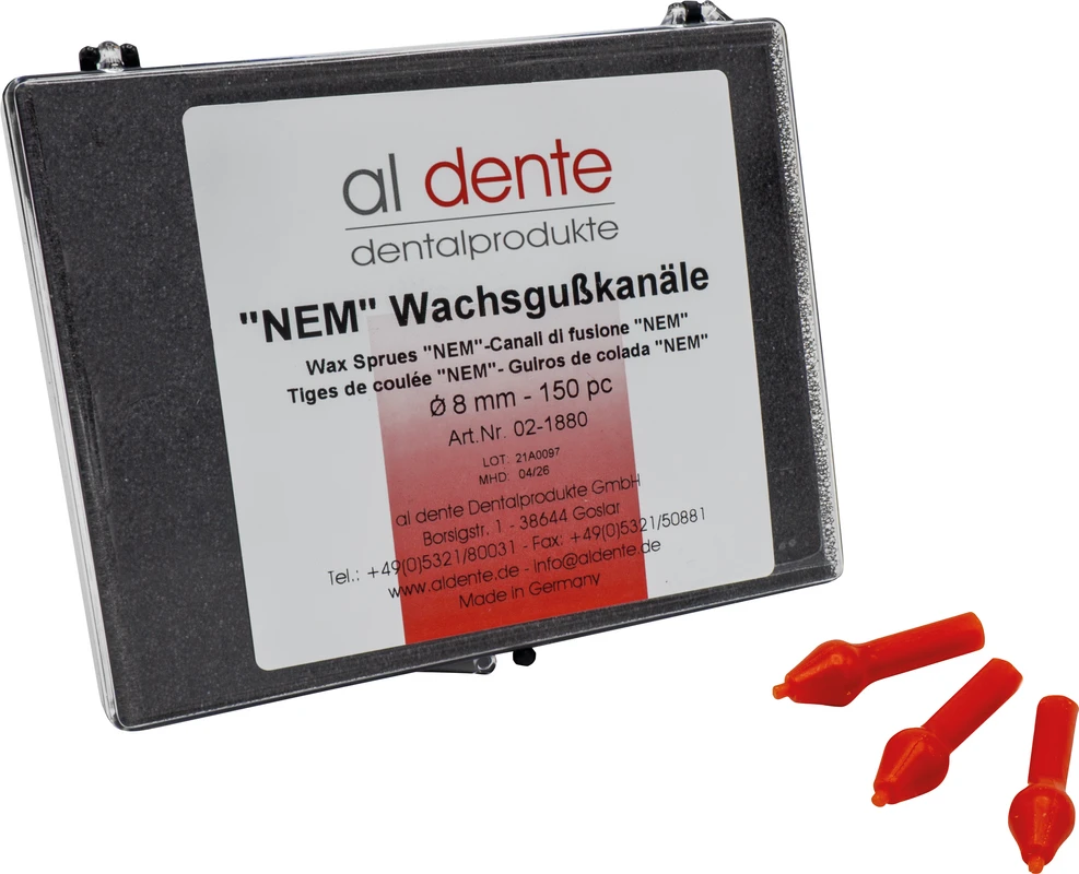 Strömungsgünstigste Form des Gusskanals. Das Ergebnis ist ein homogeneres Gussgefüge ohne Lunker. al dente Guss-Sticks „EM“ mit Kopfdurchmesser 6–7–8 mm für Edelmetalllegierungen. al dente Guss-Sticks „NEM“ mit Kopfdurchmesser 7–8–9 mm und vergrößertem Kanalquerschnitt speziell für Vakuumdruckguss sowie edelmetallreduzierte und NEM Legierungen.