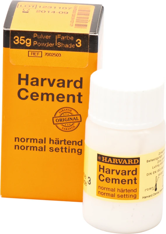 Harvard Cement, das Original. Zinkphosphatzement für die definitive Befestigung von Kronen, Brücken, Inlays und Onlays auf natürlichen Zahnstümpfen und für Zementierungen implantatgetragener Suprakonstruktionen.