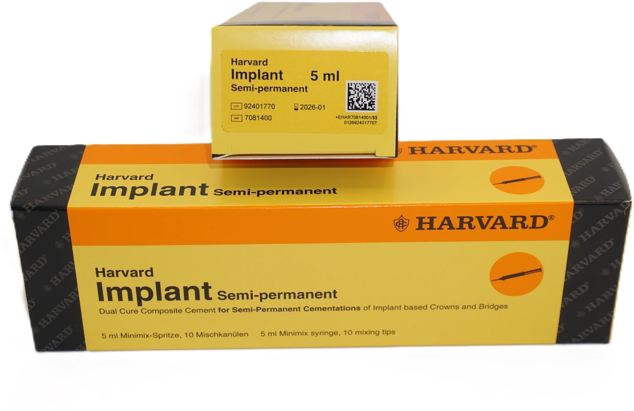 Harvard Implant ist ein dualhärtender Zement zur langzeitprovisorischen Befestigung implantatgetragener Kronen und Brücken. Optimal ausgewogene Hafteigenschaften zwischen Haltbarkeit einerseits und Wiederentfernbarkeit andererseits ermöglichen diese sichere langzeitprovisorische Befestigung. Das ausgehärtete Material ist elastisch und dämpft dadurch den Kaudruck auf dem Implantat. Harvard Implant expandiert leicht, ohne jedoch die Okklusion zu verändern, und gewährleistet so einen sicheren Randschluss. Die Suprakonstruktion kann jederzeit wieder ausgegliedert werden. Zudem enthält das Material Zinkoxid, das keinen bakteriellen Zutritt zulässt.