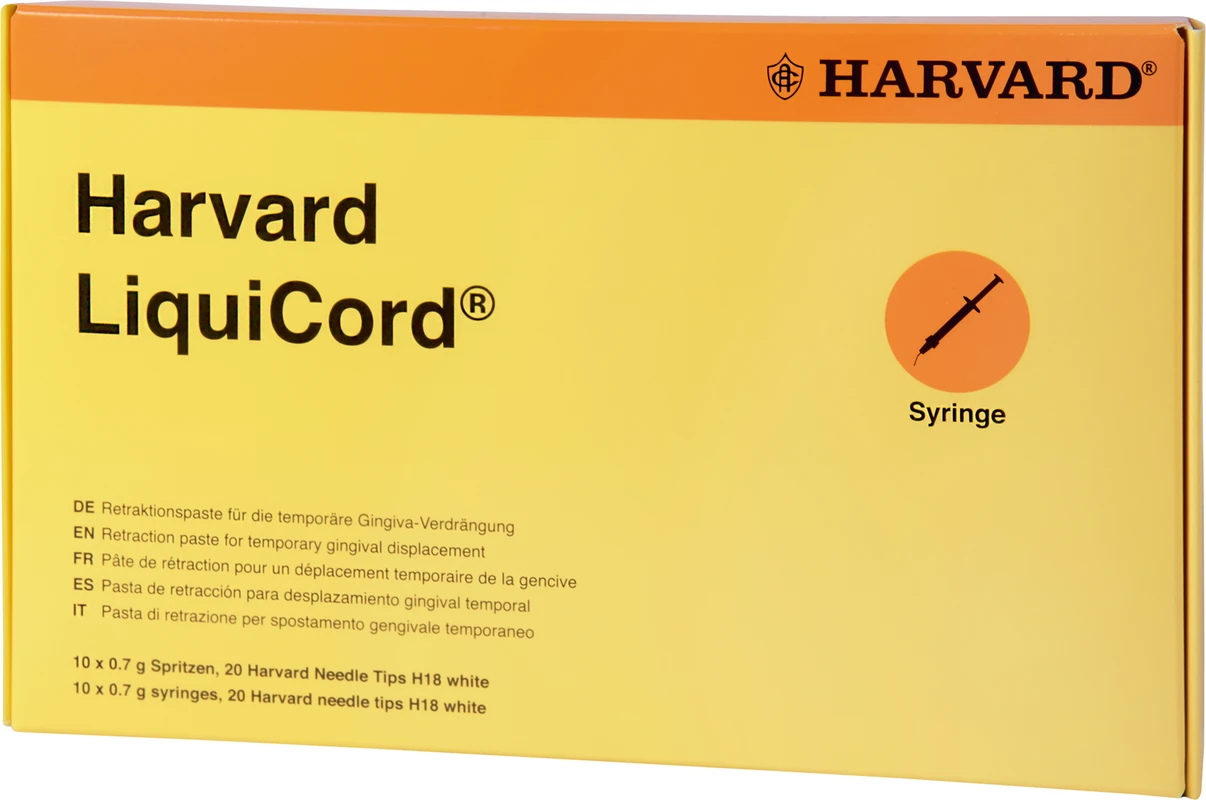 Harvard LiquiCord® ist ein Retraktionsmaterial zur temporären Gingiva-Verdrängung. Obendrein hat Harvard LiquiCord® einen hämostatischen Effekt. Das Material wird direkt in den Sulcus appliziert und ist dabei gut verträglich mit Abformmassen. Nach 2 Minuten Einwirkzeit ermöglicht es einen trockenen, sauberen und erweiterten Sulkus. Abhängig von der klinischen Situation und der jeweiligen Arbeitsweise kann Harvard LiquiCord® direkt oder mit konventionellen Retraktionsfäden ggf. mit Unterstützung von Kompressionskäppchen verwendet werden.