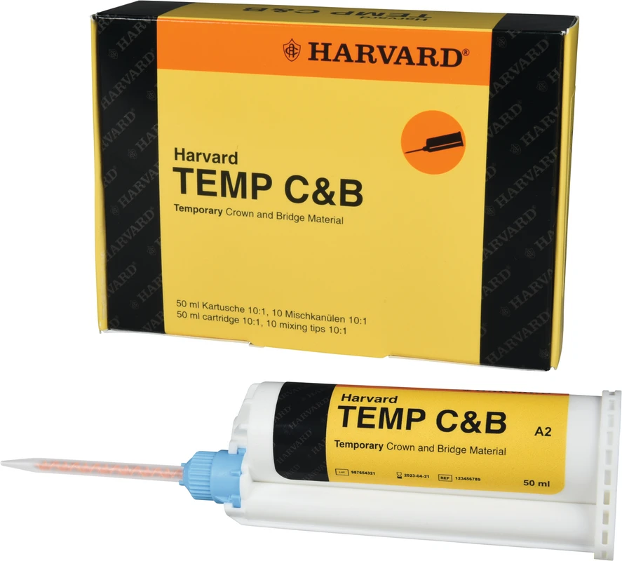 Harvard TEMP C&B ist ein selbsthärtendes Composite-Material zur Erstellung von provisorischen Kronen, Brücken, Inlays, Onlays und Veneers. Wegen seiner hohen Endhärte und Elastizität ist TEMP C&B auch für die Herstellung großer Brücken hervorragend geeignet. Das Material ist bereits nach 4:30 min ausgehärtet. Der geringe Temperaturanstieg bei der Polymerisation (+3,6 %) ist dabei schonend für die Pulpa und nicht unangenehm für den Patienten. Bei Beschädigungen am Provisorium kann das Material selbst zur Reparatur genommen werden. Die natürliche Fluoreszenz und die gute Auswahl an Farben gewährleisten ästhetische Provisorien.
