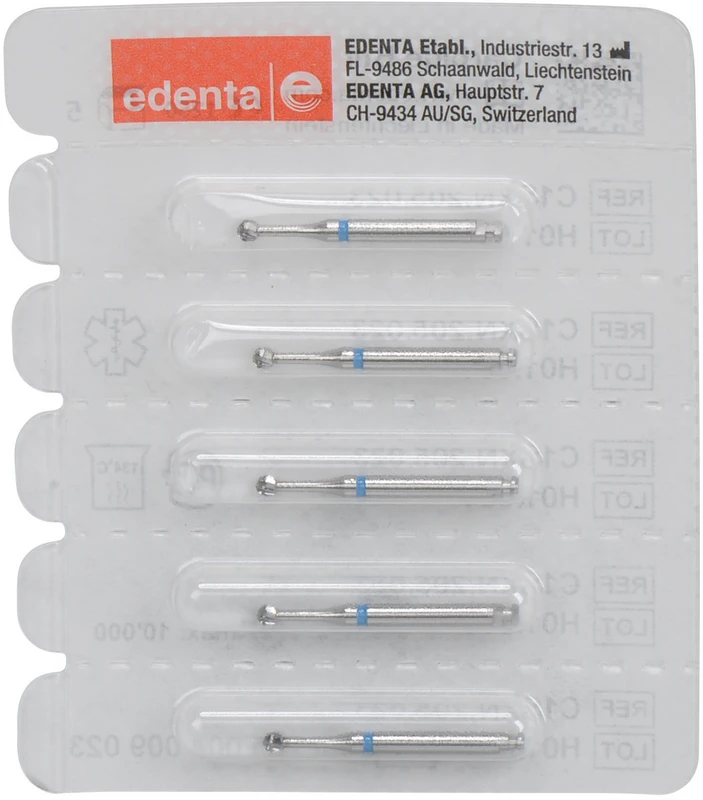 Schnittfreudige Kreuzverzahnung für vibrationsarme Behandlung und schlanker Halsgeometrie für gute Sicht.