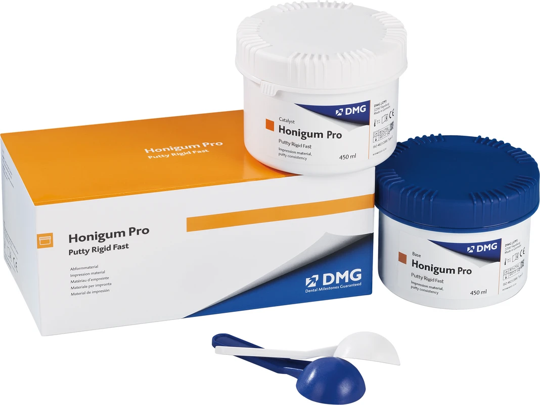 Honigum Pro Putty ist das Präzisionsmaterial in Putty-Konsistenz für detailgetreue Abformungen von Kronen und Brücken, Inlays und Onlays. Das Material verfügt über eine sehr gute Erhärtung bereits ab Mischbeginn sowie über eine sehr gute Reißfestigkeit bei hohem Rückstellvermögen. Honigum Pro Putty ist neben der klassischen Dose zur Handanmischung auch in der praktischen MixStar-Kartusche erhältlich.