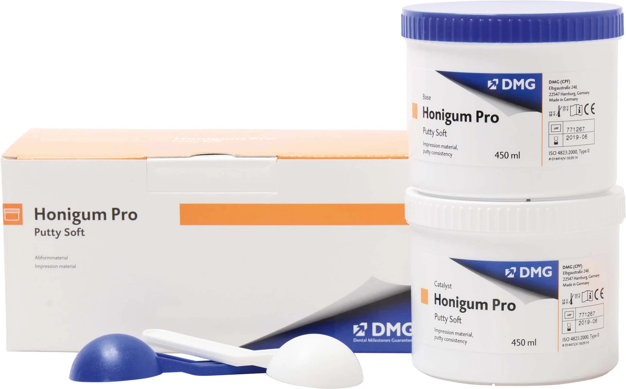 Honigum Pro Putty ist das Präzisionsmaterial in Putty-Konsistenz für detailgetreue Abformungen von Kronen und Brücken, Inlays und Onlays. Das Material verfügt über eine sehr gute Erhärtung bereits ab Mischbeginn sowie über eine sehr gute Reißfestigkeit bei hohem Rückstellvermögen. Honigum Pro Putty ist neben der klassischen Dose zur Handanmischung auch in der praktischen MixStar-Kartusche erhältlich.