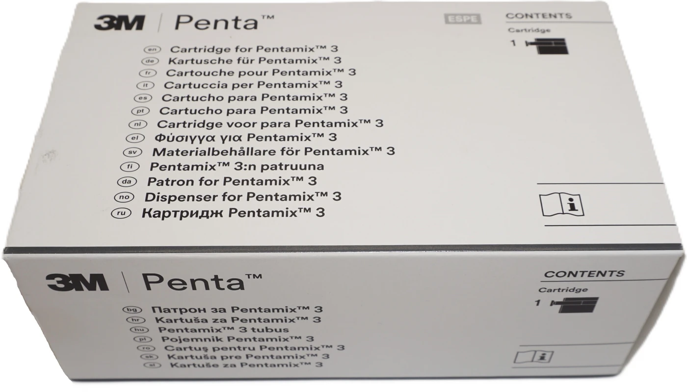 Völlig homogen und blasenfrei auf Knopfdruck: Das 3M™ Pentamix™ 3 Automatische Mischgerät liefert Mischungen für absolut akkurate Abformungen und perfekt sitzende Restaurationen.Maximale Effizienz durch schnelleres Anmischen und AusgebenSchnelles Arbeiten für schnell abbindende MaterialienSehr kleine Standfläche – spart wertvollen PlatzEinfach und ergonomisch, verbesserte Handhabung durch Bedienung per Knopfdruck von beiden Seiten des GerätsLeichtes Wechseln der Kartuschen, müheloses Aufsetzen der MischkanülenAusstoßkraft bis zu 6.500 N, elektronisch begrenzt auf 10.000 N (± 20%)Wandhalterung erhältlichZum automatischen Anmischen und Dosieren der folgenden Abformmaterialien:Polyether Präzisionsabformmaterialien der Marken 3M™ Impregum™ Penta™ Soft 3M™, Impregum™ Penta™ Soft Quick, 3M™ Impregum™ Penta™ H DuoSoft™, 3M™ Impregum™ Penta™ H DuoSoft™ Quick, 3M™ Impregum™ Penta™ L DuoSoft™, 3M™ Impregum™ Penta™, 3M™ Permadyne™ Penta™ H, 3M™ Permadyne™ Penta™ L.Ebenso für A-Silikon Präzisionsabformmaterialien der Marken 3M™ Imprint™ 4 Penta™ Putty 3M™, Imprint™ 4 Penta™ Heavy, 3M™ Imprint™ 4 Penta™ Super Quick Heavy, 3M™ Express™ 2 Penta™ Putty, 3M™ Express™ 2 Penta™ Putty Soft, 3M™ Express™ 2 Penta™ H, 3M™ Express™ 2 Penta™ H Quick, 3M™ Express™ 2 Penta™ H Universal Quick, 3M™ Dimension™ Penta™ H, 3M™ Dimension™ Penta™ H Quick, 3M™ Dimension™ Penta™ L.Ebenso für A-Silikon Alginatersatz der Marken: 3M™ Position™ Penta™, 3M™ Position™ Penta™ Quick.Ebenso für Bissregistrierungsmaterial der Marke 3M™ Ramitec™ Penta™, Imprint™ 4 Penta™ Putty, Imprint™ 4 Penta™ Heavy, Imprint™ 4 Penta™ Super Quick Heavy, Express™, 2 Penta™ Putty, Express™ 2 Penta™ Putty Soft, Express™ 2 Penta™ H, Express™ 2 Penta™ H Quick, Express™ 2 Penta™ H Universal Quick, Dimension™ Penta™ H, Dimension™ Penta™ H Quick, Dimension™ Penta™ L. Inhalt Mischgerät