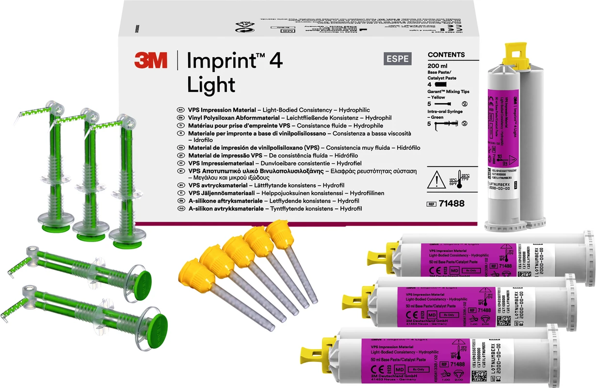 3M™ Imprint™ 4 VPS Abformmaterial ist in verschiedenen Varianten mit normalen und kurzen intraoralen Abbindezeiten erhältlich, so dass Sie das richtige Material für Ihre Abformung wählen können. Das macht es Ihnen leichter, Abformungen mit hoher Genauigkeit durchzuführen und somit die Grundlage für passgenaue Restaurationen zu schaffen, während gleichzeitig der Stress für Sie und Ihre Patienten reduziert wird.