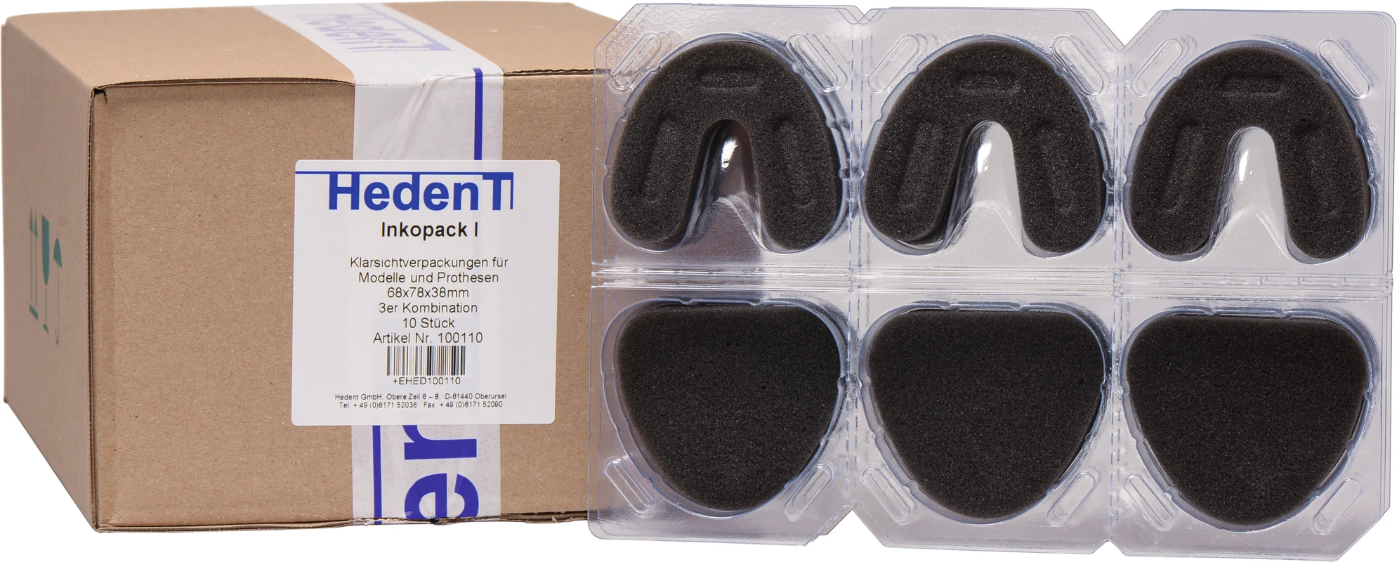 Klarsichtverpackungen für Modelle und Prothesen. Im Hedent Inkopack sind Abdrücke, Gipsmodelle und Zahnprothesen für den Transport schnell und sicher verpackt. Die Klarsichtverpackung vermittelt den zahntechnischen Arbeiten einen hervorragenden optischen Eindruck. Hedent Inkopack ist stapelbar und für Lagerung von kieferorthopädischen Modellen bestens geeignet.