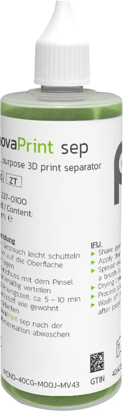 InovaPrint sep ist eine Isolierung, die mit einer hauchdünnen Schicht das 3D gedruckte Modell optimal gegen Dentalkunststoffe (Autopolymerisat und Composite) isoliert. Ob in der Kieferorthopädie oder Zahntechnik – Einsatz findet InovaPrint sep überall dort, wo 3D gedruckte Modelle verwendet werden. Perfekte Ergebnisse auf 3D gedruckten Resin- und Filament Modellen.