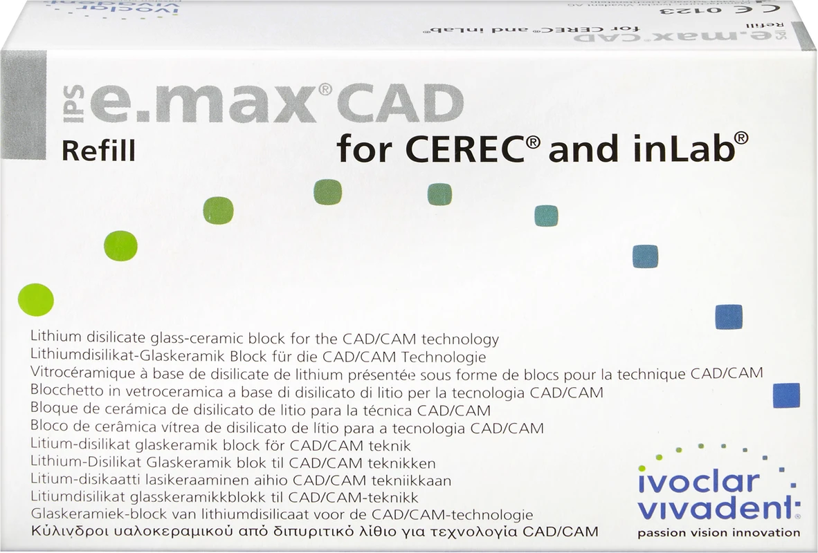 Die IPS e.max CAD for CEREC/inLab ist eine hochfeste Lithiumdisilikat-Vollkeramik, mit idealen ästhetischen Eigenschaften. Die Keramikblocks sind optimal für die Herstellung von vollanatomischen Kronen, Inlays und Veneers geeignet und werden im inLab-System oder CEREC-System (Sirona) verarbeitet. Die Blocks sind in unkristallisiertem Zustand bläulich und leicht bearbeitbar. Nach dem Kristallisationsbrand ist die Keramik zahnfarben und hochfest. IPS e.max Kronen aus CAD LT können selbstadhäsiv oder konventionell befestigt werden.