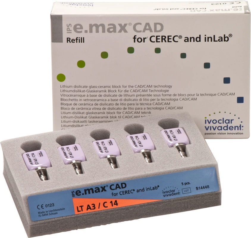 Die IPS e.max CAD for CEREC/inLab ist eine hochfeste Lithiumdisilikat-Vollkeramik, mit idealen ästhetischen Eigenschaften. Die Keramikblocks sind optimal für die Herstellung von vollanatomischen Kronen, Inlays und Veneers geeignet und werden im inLab-System oder CEREC-System (Sirona) verarbeitet. Die Blocks sind in unkristallisiertem Zustand bläulich und leicht bearbeitbar. Nach dem Kristallisationsbrand ist die Keramik zahnfarben und hochfest. IPS e.max Kronen aus CAD LT können selbstadhäsiv oder konventionell befestigt werden.