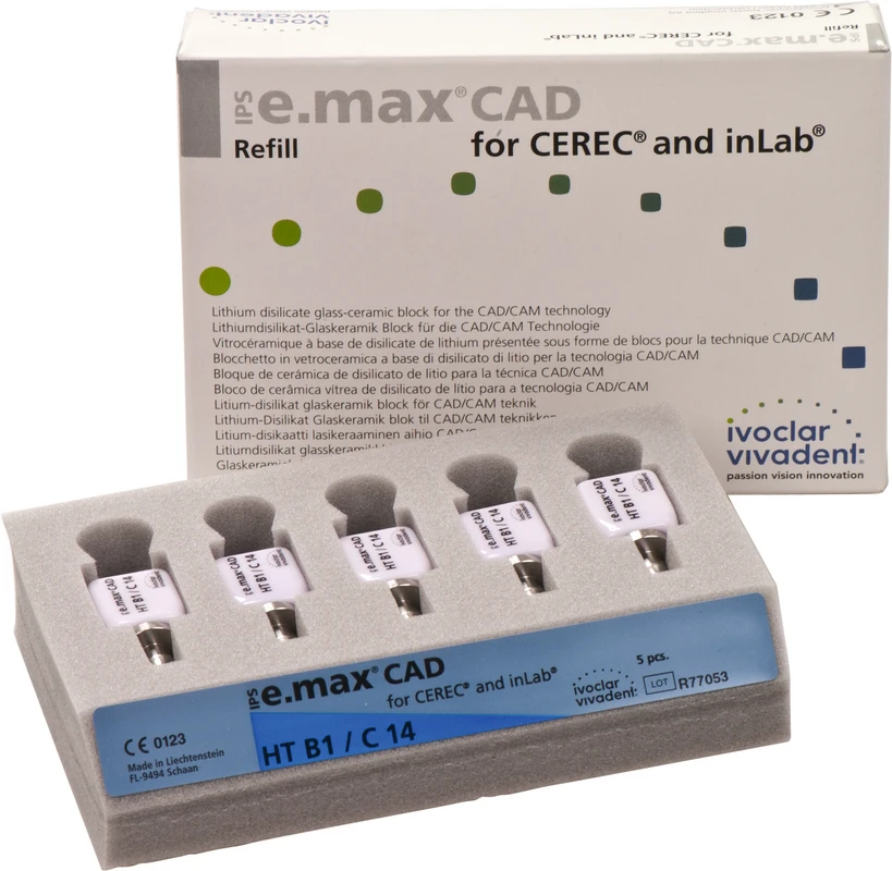 Die IPS e.max CAD for CEREC/inLab ist eine hochfeste Lithiumdisilikat-Vollkeramik, mit idealen ästhetischen Eigenschaften. Die Keramikblocks sind optimal für die Herstellung von vollanatomischen Kronen, Inlays und Veneers geeignet und werden im inLab-System oder CEREC-System (Sirona) verarbeitet. Die Blocks sind in unkristallisiertem Zustand bläulich und leicht bearbeitbar. Nach dem Kristallisationsbrand ist die Keramik zahnfarben und hochfest. IPS e.max Kronen aus CAD LT können selbstadhäsiv oder konventionell befestigt werden.