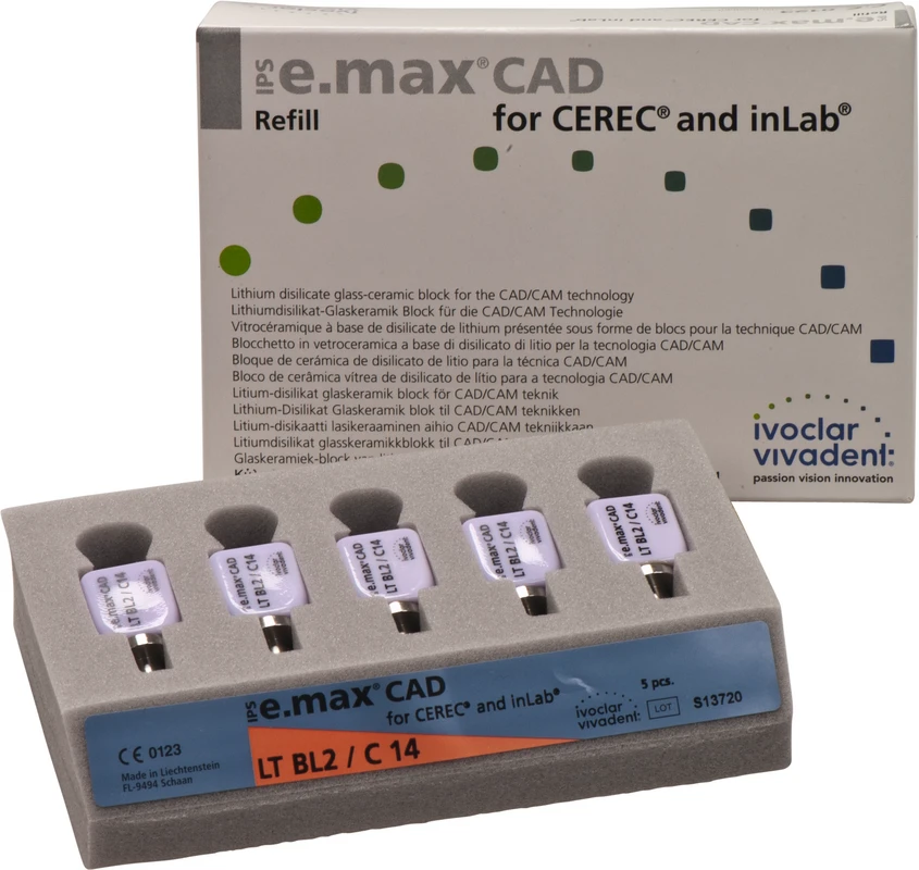 Die IPS e.max CAD for CEREC/inLab ist eine hochfeste Lithiumdisilikat-Vollkeramik, mit idealen ästhetischen Eigenschaften. Die Keramikblocks sind optimal für die Herstellung von vollanatomischen Kronen, Inlays und Veneers geeignet und werden im inLab-System oder CEREC-System (Sirona) verarbeitet. Die Blocks sind in unkristallisiertem Zustand bläulich und leicht bearbeitbar. Nach dem Kristallisationsbrand ist die Keramik zahnfarben und hochfest. IPS e.max Kronen aus CAD LT können selbstadhäsiv oder konventionell befestigt werden.