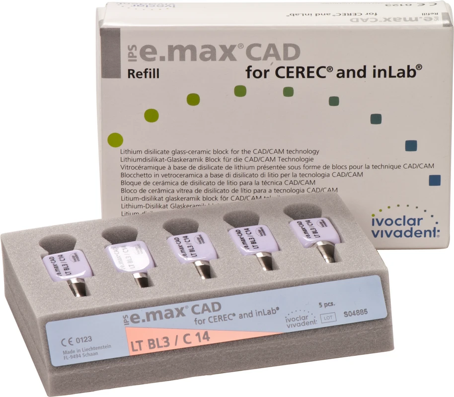 Die IPS e.max CAD for CEREC/inLab ist eine hochfeste Lithiumdisilikat-Vollkeramik, mit idealen ästhetischen Eigenschaften. Die Keramikblocks sind optimal für die Herstellung von vollanatomischen Kronen, Inlays und Veneers geeignet und werden im inLab-System oder CEREC-System (Sirona) verarbeitet. Die Blocks sind in unkristallisiertem Zustand bläulich und leicht bearbeitbar. Nach dem Kristallisationsbrand ist die Keramik zahnfarben und hochfest. IPS e.max Kronen aus CAD LT können selbstadhäsiv oder konventionell befestigt werden.