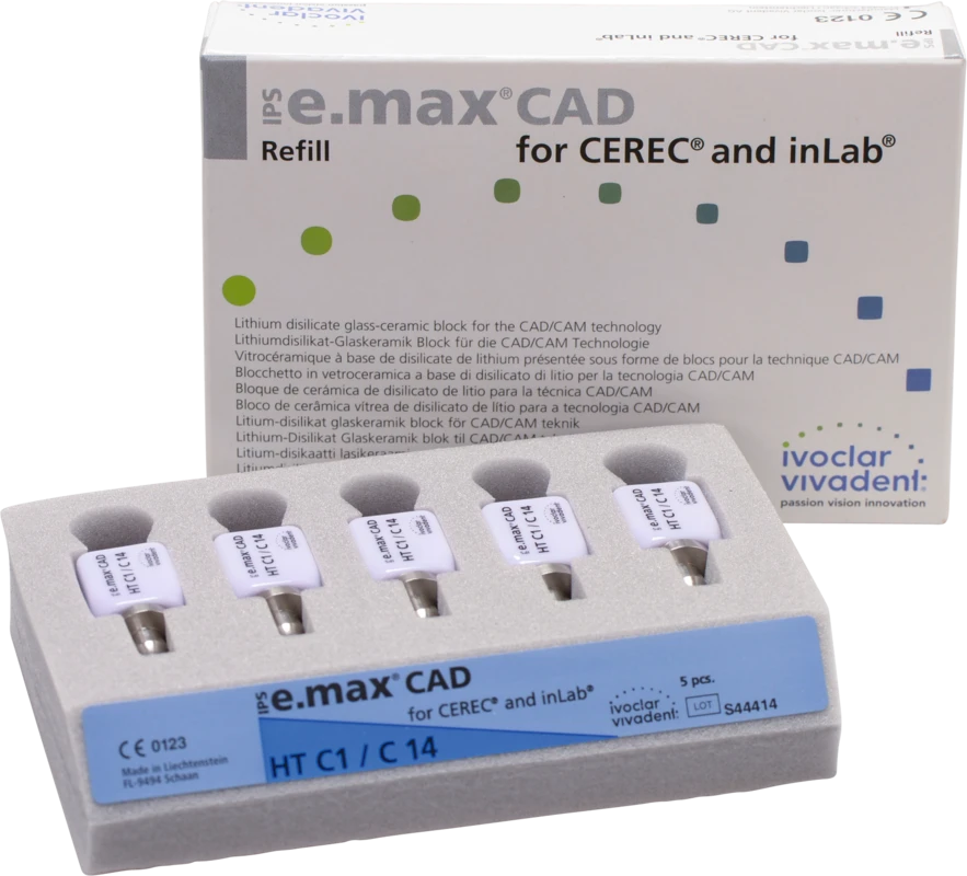 Die IPS e.max CAD for CEREC/inLab ist eine hochfeste Lithiumdisilikat-Vollkeramik, mit idealen ästhetischen Eigenschaften. Die Keramikblocks sind optimal für die Herstellung von vollanatomischen Kronen, Inlays und Veneers geeignet und werden im inLab-System oder CEREC-System (Sirona) verarbeitet. Die Blocks sind in unkristallisiertem Zustand bläulich und leicht bearbeitbar. Nach dem Kristallisationsbrand ist die Keramik zahnfarben und hochfest. IPS e.max Kronen aus CAD LT können selbstadhäsiv oder konventionell befestigt werden.